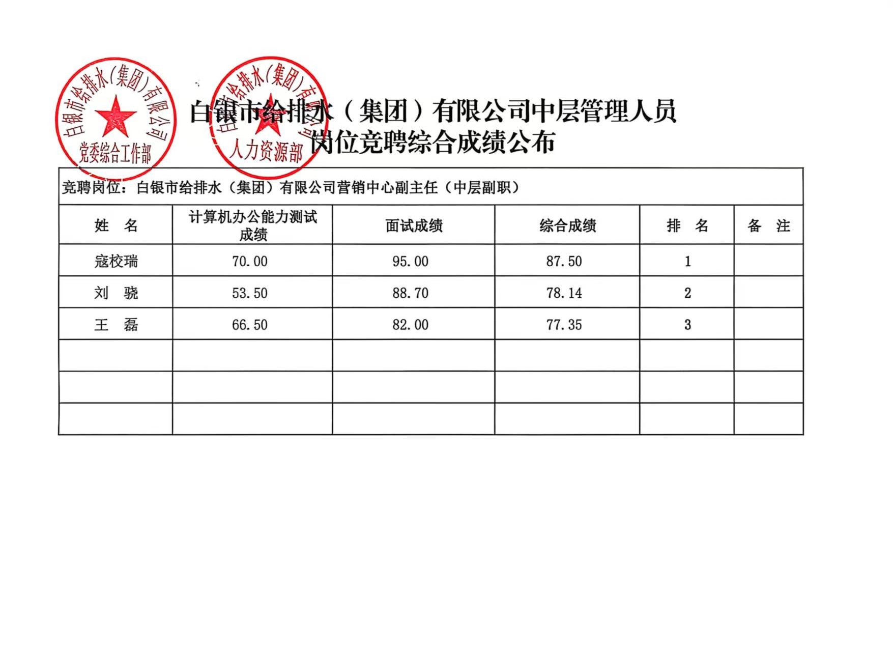 白銀市給排水(集團(tuán))有限公司中層管理人員崗位競聘綜合成績公布